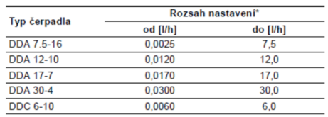 Dávkovací čerpadlo Grundfos DDC 6-10 je umístěno ve stroji (nikoli v úpravně vody). Dávkovací čerpadlo je možno provozovat v režimu ručního nastavení s těmito možnostmi rozsahu výkonu: