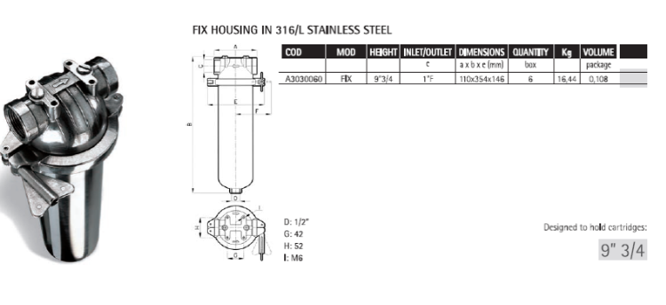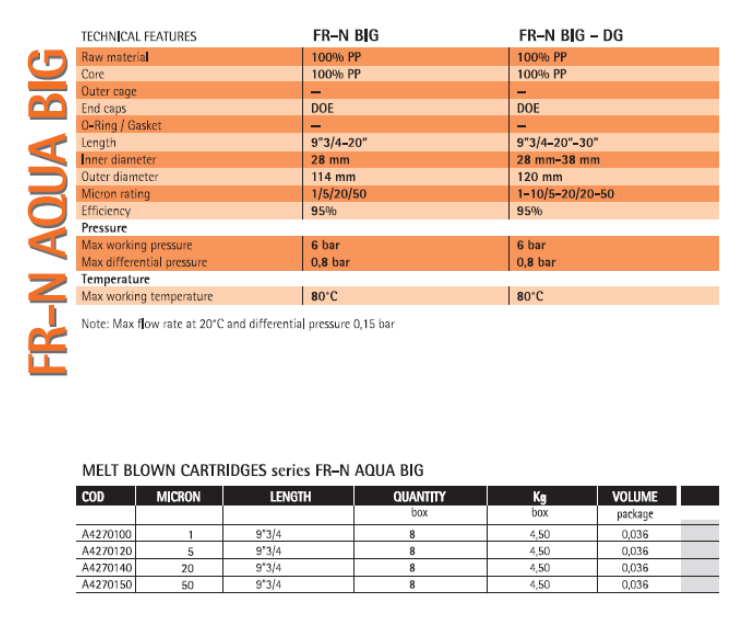 - Hrubá filtrace s vložkou z napékaného PP účinnosti 20 mikromů typu FR-N (95% filtrace), tělo filtru z nerez oceli AISI 316 velikosti 9 ¾“